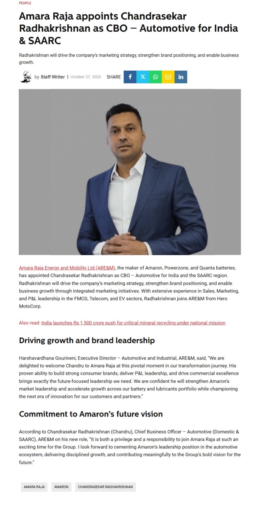 Chandrasekar Radhakrishnan joins Amara Raja Energy & Mobility as Chief Business Officer – Automotive (Domestic & SAARC)